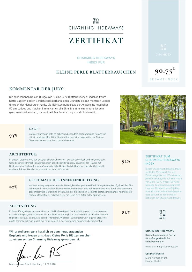 Die sehr schönen Design-Bungalows "Kleine Perle Blätterrauschen" liegen in traumhafter Lage im oberen Bereich eines parkähnlichen Grundstücks mit mehreren Lodges direkt an der Flensburger Förde. Die kleinsten Bungalows der Anlage sind kuschelige 50 qm Lodges und machen ihrem Namen alle Ehre. Die Inneneinrichtung ist sehr geschmackvoll, modern, klar und hell. Die Ausstattung ist sehr hochwertig.