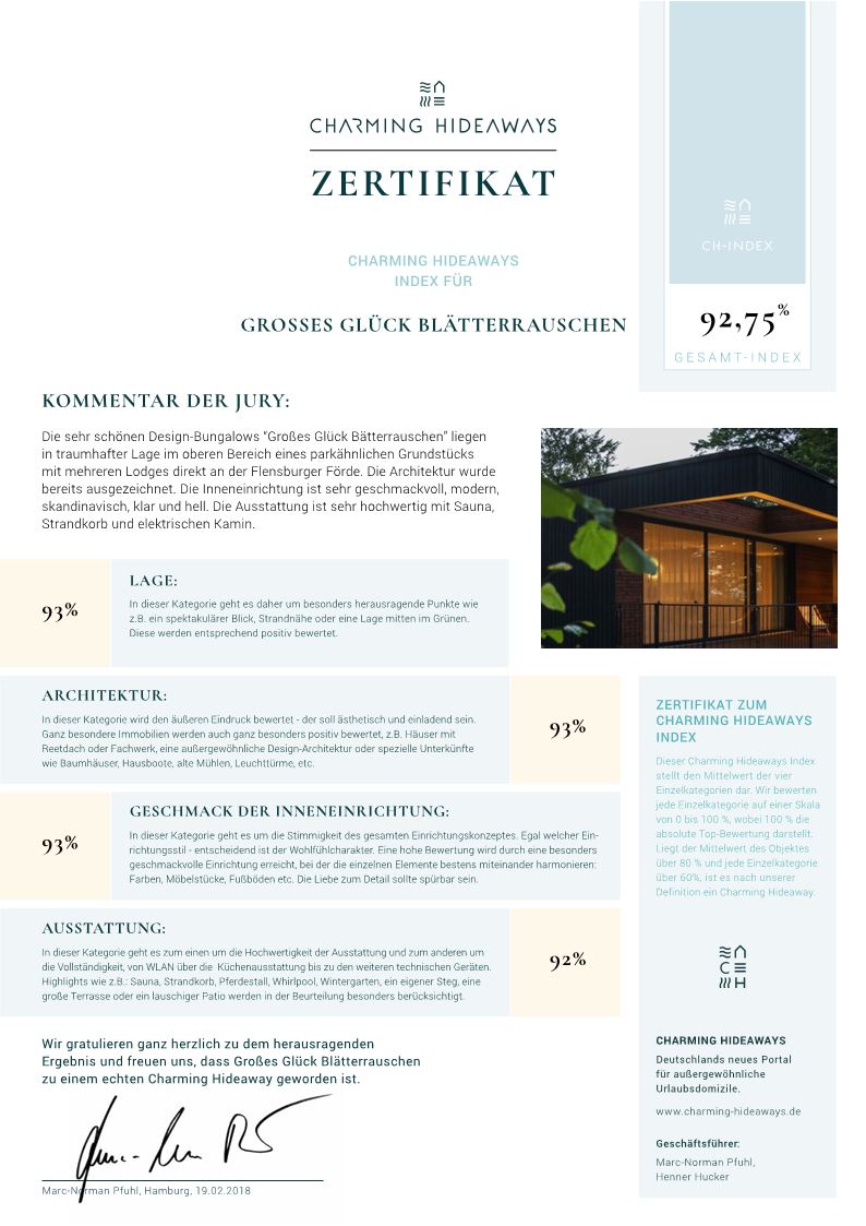 Die sehr schönen Design-Bungalows "Großes Glück Bätterrauschen" liegen in traumhafter Lage im oberen Bereich eines parkähnlichen Grundstücks mit mehreren Lodges direkt an der Flensburger Förde. Die Architektur wurde bereits ausgezeichnet. Die Inneneinrichtung ist sehr geschmackvoll, modern, skandinavisch, klar und hell. Die Ausstattung ist sehr hochwertig mit Sauna, Strandkorb und elektrischen Kamin.