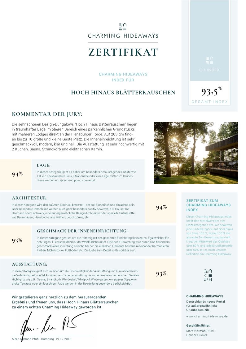Die sehr schönen Design-Bungalows "Hoch Hinaus Bätterrauschen" liegen in traumhafter Lage im oberen Bereich eines parkähnlichen Grundstücks mit mehreren Lodges direkt an der Flensburger Förde. Auf 203 qm finden bis zu 10 große und kleine Gäste Platz. Die Inneneinreichtung ist sehr geschmackvoll, modern, klar und hell. Die Ausstattung ist sehr hochwertig mit 2 Küchen, Sauna, Strandkorb und elektrischen Kamin.
