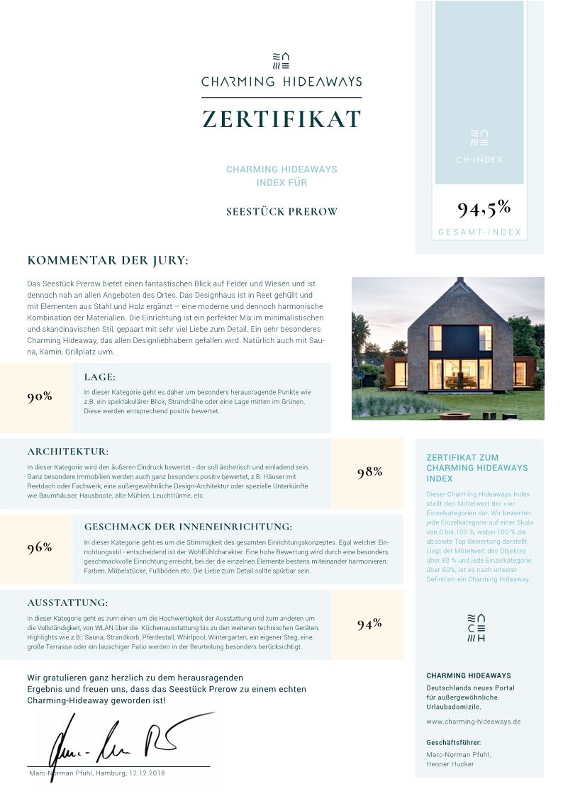 Das Seestück bietet das, was der Urlauber benötigt, drängt sich jedoch nicht auf. Alles ist an seinem Platz. Der Gast kann das Haus und seine Einrichtungen intensiv nutzen, muß es aber nicht. Das Haus bietet Komfort, verzichtet auf Glamour und läßt der überwältigenden Natur des Darß den Vortritt, nimmt andererseits in Umgebung und Historie Anleihen für Rohrdach- Fassade und Stahl, Sichtestrich der an Sandstrand erinnert, Holz und anderen Materialien, die man anfassen möchte.
