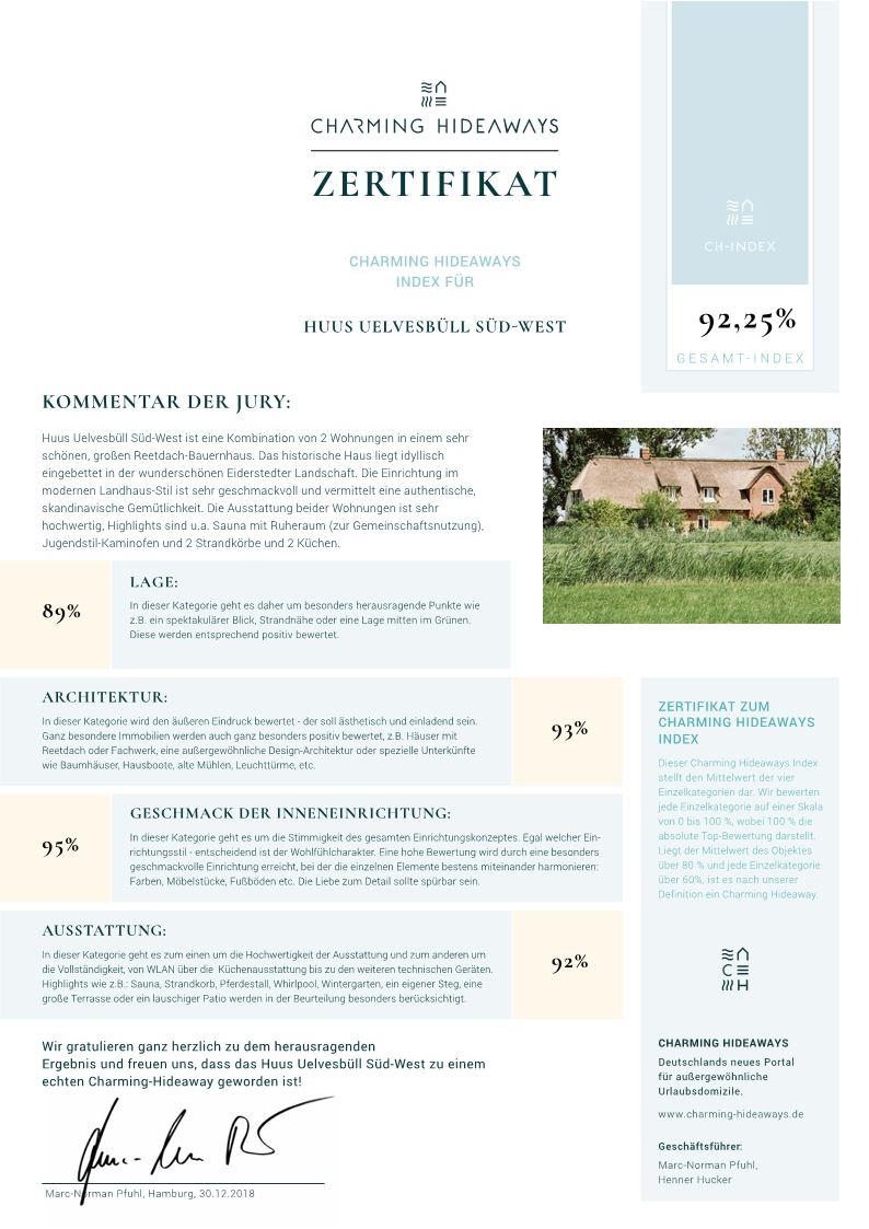 Huus Uelvesbüll ist ein einzigartiger Rückzugsort -, allein gelegen, naturverbunden, ökologiebewusst saniert, wunderschön eingerichtet. Sie erfahren hier die Weite des Horizont und die in jedem Moment wechselnden Formationen seiner Wolken wie nirgends sonst. Außen und Innen sind aufeinander bezogen, das helle Licht des Nordens erfüllt die Räume der antike schwedische Kachelofen wärmt Sie an kalten Herbst-und Wintertagen. Der Ruheraum des Wellnessbereiches gewährt Ihnen einen Panoramablick über angrenzende Wiesen in Richtung des Dorfes Uelvesbüll und bietet einen zusätzlichen stillen Ort, z.B. zum morgendlichen Meditieren oder für persönliche Gespräche.