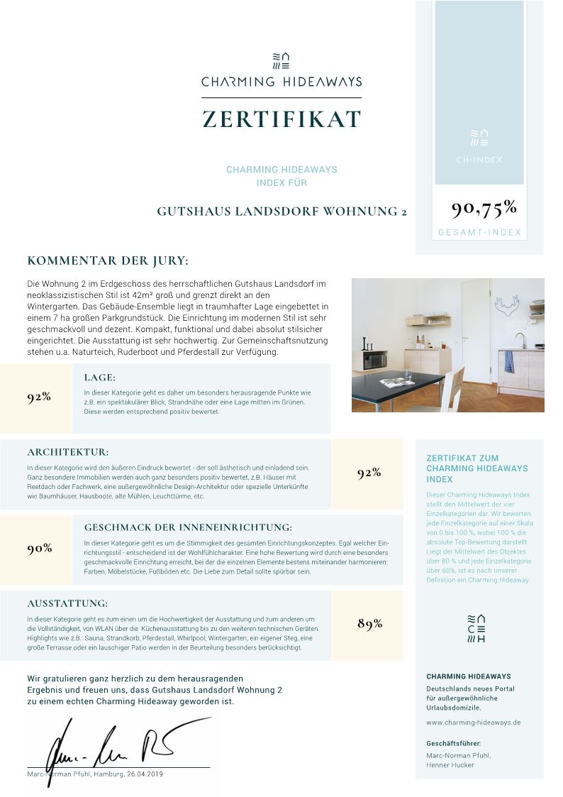 Die Wohnung 2 im Erdgeschoss des herrschaftlichen Gutshaus Landsdorf im neoklassizistischen Stil ist 42 qm groß und grenzt direkt an den Wintergarten. Das Gebäude-Ensemble liegt in traumhafter Lage eingebettet in einem 7 ha großen Parkgrundstück. Die Einrichtung im modernen Stil ist sehr geschmackvoll und dezent. Kompakt, funktional und dabei absolut stilsicher eingerichtet. Die Ausstattung ist sehr hochwertig. Zur Gemeinschaftsnutzung stehen u.a. Naturteich, Ruderboot und Pferdestall zur Verfügung.