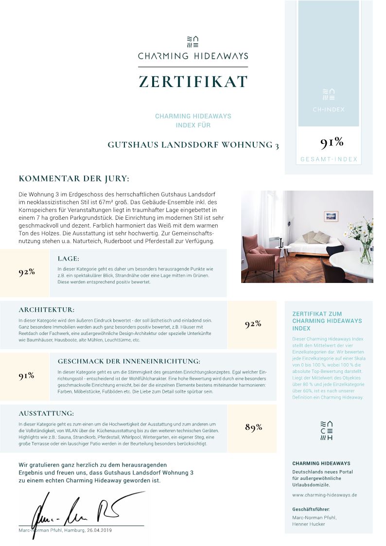Die Wohnung 3 im Erdgeschoss des herrschaftlichen Gutshaus Landsdorf im neoklassizistischen Stil ist 67 qm groß. Das Gebäude-Ensemble inkl. des Kornspeichers für Veranstaltungen liegt in traumhafter Lage eingebettet in einem 7 ha großen Parkgrundstück. Die Einrichtung im modernen Stil ist sehr geschmackvoll und dezent. Farblich harmoniert das Weiß mit dem warmen Ton des Holzes. Die Ausstattung ist sehr hochwertig. Zur Gemeinschaftsnutzung stehen u.a. Naturteich, Ruderboot und Pferdestall zur Verfügung.