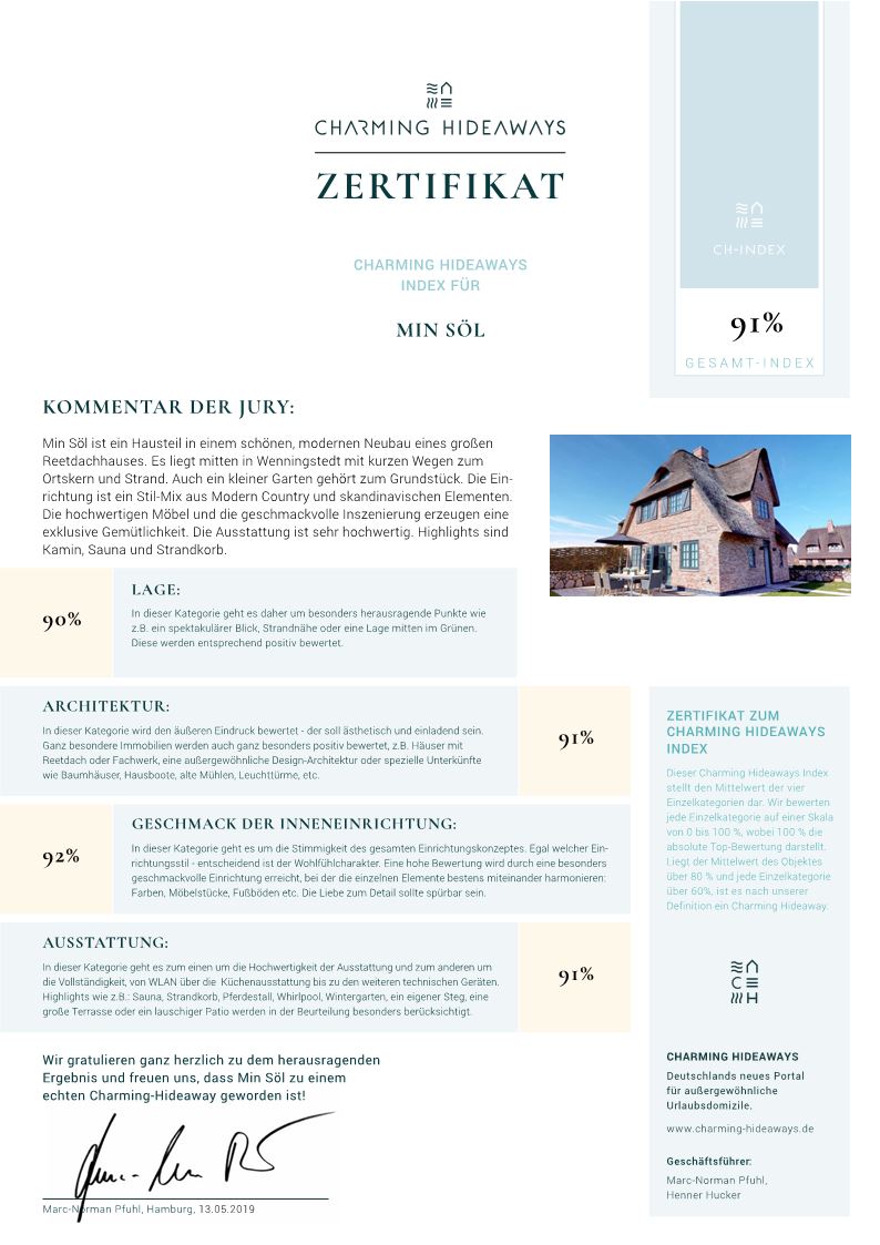 In allen Schlafräumen sowie im Wohnzimmer sind Fernseher mit Internet-Zugang installiert. Zudem finden Sie einen WLAN-Zugang im Haus. Im großzügigen Garten und auf der Terrasse mit Strandkorb lässt es sich behaglich sitzen oder liegen. Zwei PKW-Stellplätze auf dem Grundstück gehören ebenfalls zum Landhaus Min Söl .