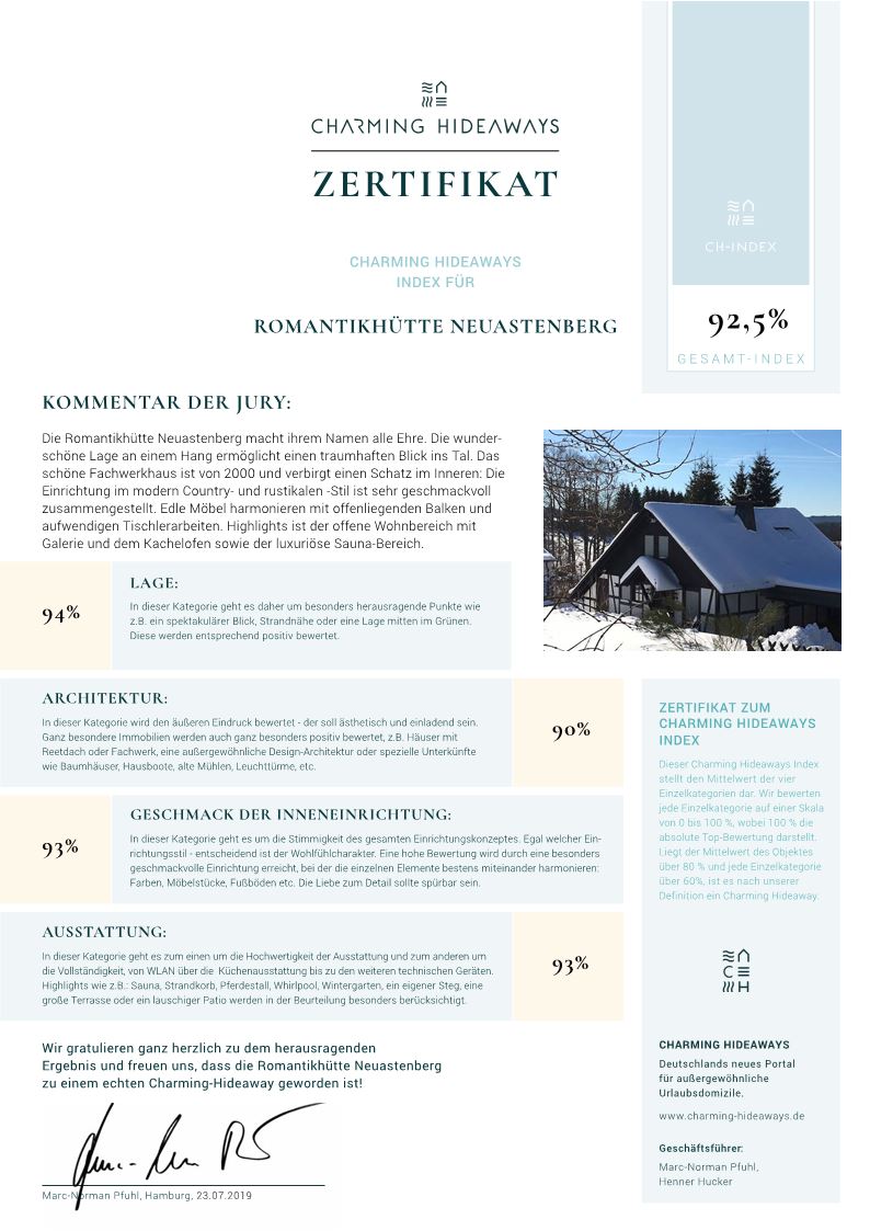 Die Romantikhütte Neuastenberg liegt sehr ruhig aber dennoch zentral. Nur ca. 200 Meter vom Skilift entfernt errechen Sie zu Fuß in 3-5 Minuten mehrere Restaurants, das Kaffeehaus mit den köstlichsten Kuchen der Region und den Skilift. Direkt neben dem Haus beginnt der Wanderweg.