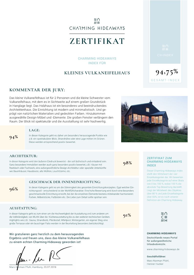 Die archaische Dramatik des kleinen Verstecks in der Landschaft spiegelt sich auch in den verwendeten Materialien wider: Der kompakte Sockel ist aus Sichtbeton mit einer rohen Brettschaloberfläche errichtet. Das darauf aufgelagerte Holzhaus ist mit rohen Holz-Bohlen in Stülpschalung verkleidet. Dieses Holz ist karbonisiert, d.h. die Oberfläche wurde beflammt bis zur Ausbildung der oberen Schicht als schwarze Holzkohle – eine raue und archaische Behandlung, die dem Verwitterungsprozess des Holzes Einhalt gebietet. Wie bei einer Köhlerhütte bildet der Schornstein des zentralen Kamins den vertikalen Abschluss des Giebels – auch er ist mit dem schwarzen Holz bekleidet. Im Inneren setzt sich die Archaik der Materialisierung in veredelter Form fort: Ein durchgehender Bodenbelag mit Polygonplatten aus spaltrauem grünlich schimmerndem Quarzit zieht sich durch das Kontinuum aller Raumbereiche.Die im oberen Bereich weissen Innenwände werden in Höhe des Benutzers durch eine warme Holzverkleidung intimisiert. Wenige ausgesuchte Farb- und Materialakzente ergänzen das Bild.
