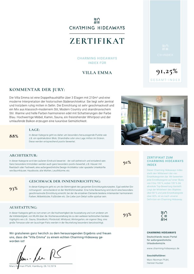 Wir waren auf der Suche nach einer Ferienimmobilie, wo kein Wunsch mehr offen bleibt. Dabei haben wir uns sehr schnell in die Villa Emma verliebt. Schon von Außen beeindruckt Sie durch Ihre besondere Architektur, wenn man dann das Haus betritt, dann merkt man schnell, dass sehr viel Liebe zum Detail überall drin steckt. Die Farbabstimmung im gesamten Haus ist sehr dem Ostseeflair angepasst, dadurch ergibt sich ein harmonisches Bild im ganzen Haus. Besonders gut gefallen hat uns von Anfang an, die hochwertige Ausstattung der Villa. Jedes Schlafzimmer verfügt über Boxspringbetten, einen großen Kleiderschrank und einen Fernseher. In zwei Schlafzimmern besteht die Möglichkeit einer Aufbettung durch einen Schlafsessel. Die Sauna bietet viel Platz und besonders der freistehende Whirlpool in der obersten Etage ist einfach einmalig. Wenn man dann auf die Dachterrasse blickt und den herrlichen Ausblick genießen kann, dann weiß man das es der perfekte Urlaubsort ist.
