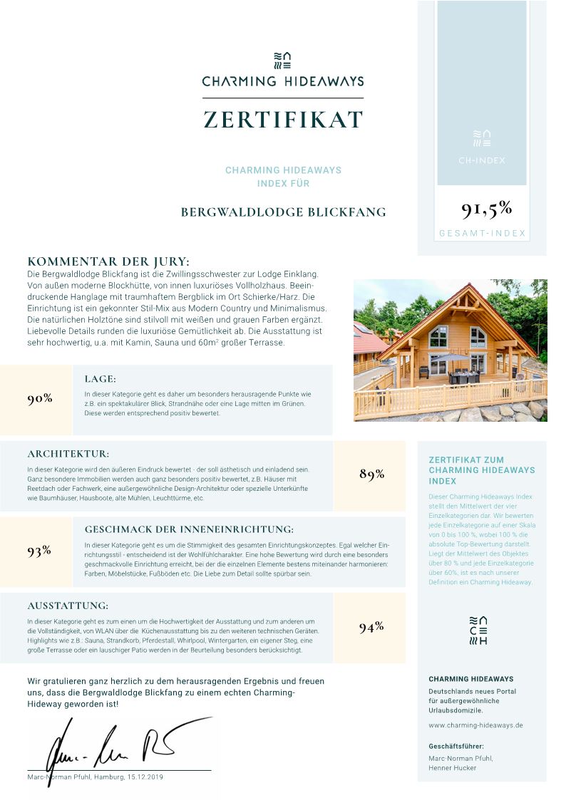 Die Antwort, warum die Bergwaldlodge Blickfang ein Charming Hideaway ist, geben uns unsere Gäste regelmäßig in Ihren Bewertungen und den Eintragungen im Gästebuch. Sie fühlen sich mindestens genauso wohl wie zu Hause und nicht selten mehr als das. Bei der Klassifizierung durch den DTV mussten wir 900 Punkte erreichen. Wir schlossen mit 1.050 ab. Unsere beiden Lodges Einklang & Blickfang sind in Schierke und Umgebung die einzigen wirklichen 5-Sterne-Umterfkünfte; d.h. Sie erwartet geprüfte Qualität.