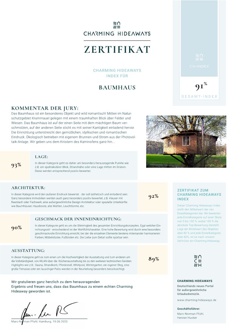 Das Baumhaus ist ein Nichtraucherdomizil, für Kinder geeignet und zu jeder Jahreszeit nutzbar. Wir bitten darum, aus Rücksicht auf Allergiker keine Haustiere mitzubringen.