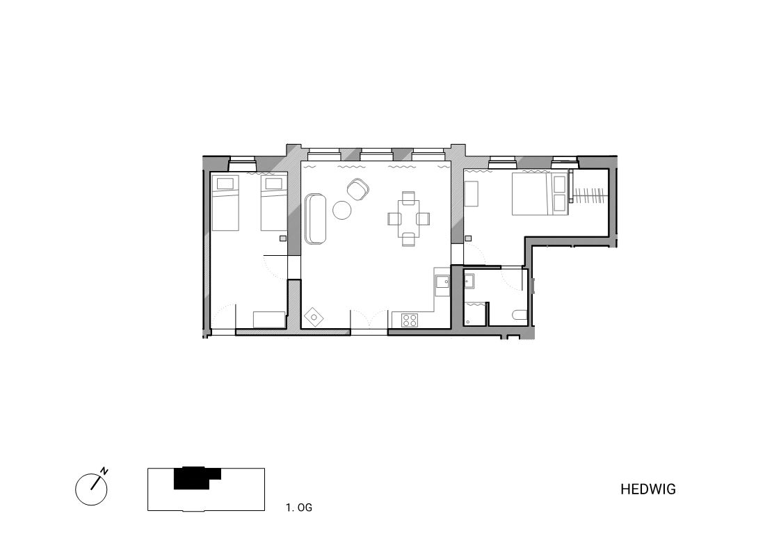 Die ca. 85 m² große Wohnung Hedwig befindet sich im ersten Stock im Mittelrisalit des Gutshauses. Von hier bietet sich über drei große Fenster ein wunderschöner und weiter Blick in die Landschaft, im Sommer mit wunderbaren Sonnenuntergängen. Die Wohnung besteht aus einem großzügigen Wohnbereich mit Parkettboden und Küchenzeile mit Spülmaschine. Die Wohnung hat zwei Schlafzimmern mit jeweils zwei Betten. Vom Schlafzimmer mit Doppelbett gelangt man zum Badezimmer.