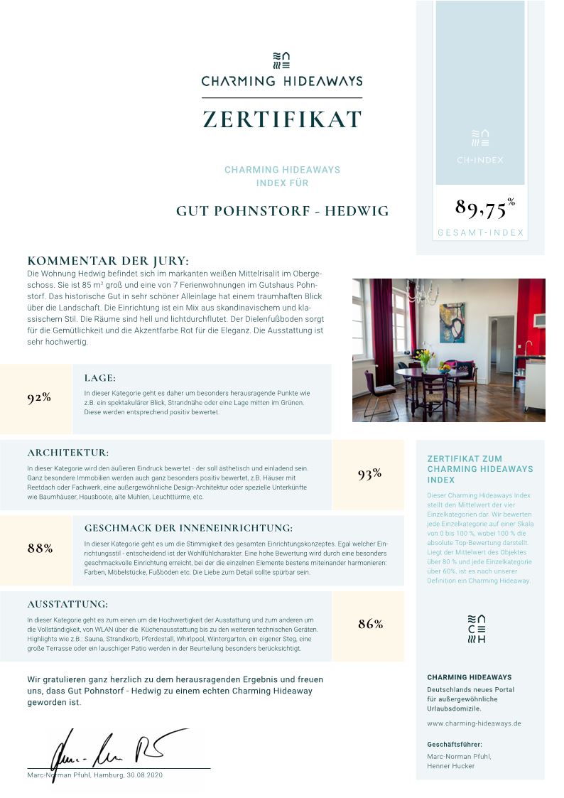 Die Wohnung Hedwig befindet sich im markanten weißen Mittelrisalit im Obergeschoss. Sie ist 85 qm groß und eine von 7 Ferienwohnungen im Gutshaus Pohnstorf. Das historische Gut in sehr schöner Alleinlage hat einem traumhaften Blick über die Landschaft. Die Einrichtung ist ein Mix aus skandinavischem und klassischem Stil. Die Räume sind hell und lichtdurchflutet. Der Dielenfußboden sorgt für die Gemütlichkeit und die Akzentfarbe Rot für die Eleganz. Die Ausstattung ist sehr hochwertig.