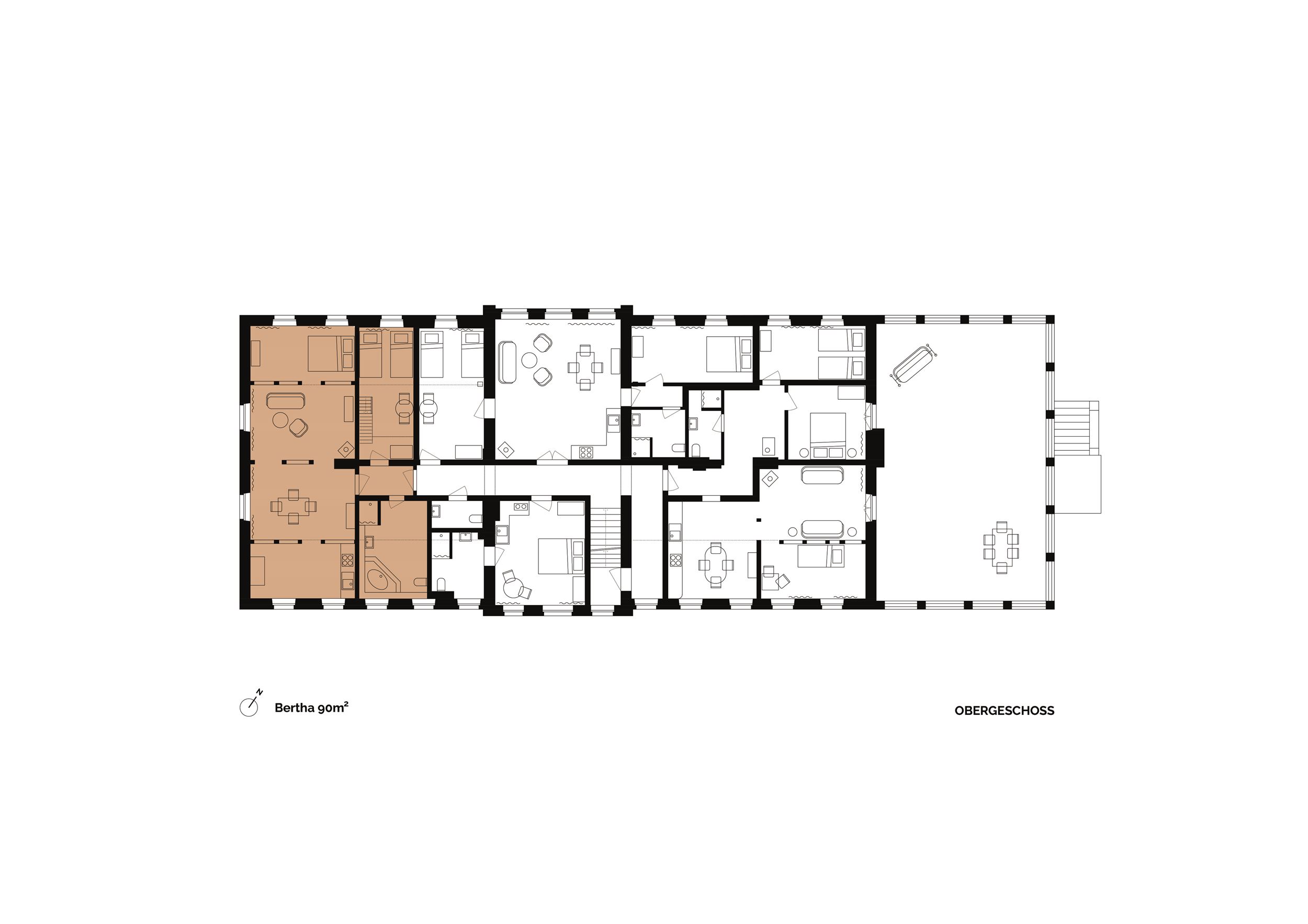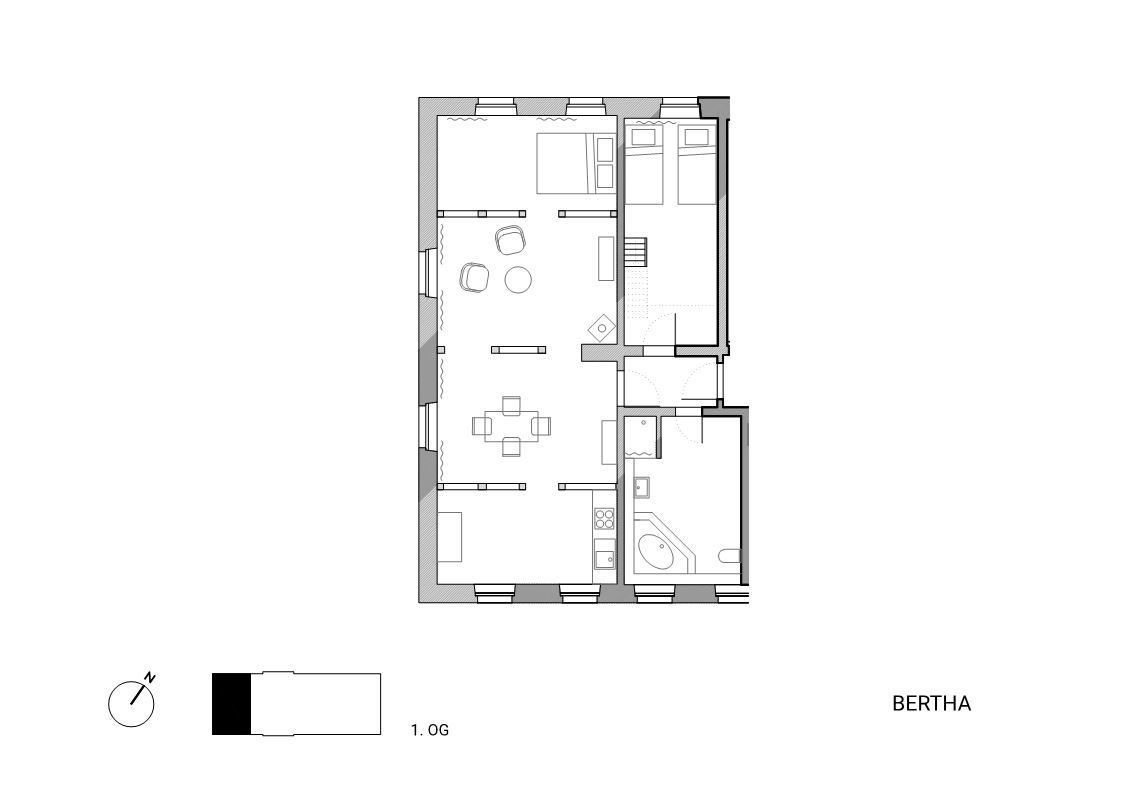 Bertha befindet sich im ersten Stock des Gutshauses. Die ca. 90 m² große Wohnung ist sehr sonnig und bietet einen herrlichen Blick in die Landschaft bis hin zum Teterower See. Der große Raum mit offenen Fachwerkelementen unterteilt sich in Küche, Esszimmer, Wohnzimmer und Schlafzimmer. Der Loftbereich ist über einen kleinen Flur erreichbar, von dem ein weiteres Schlafzimmer (mit Hochebene zum Spielen für Kinder) und ein großes Badezimmer mit Badewanne und Dusche abgehen.
