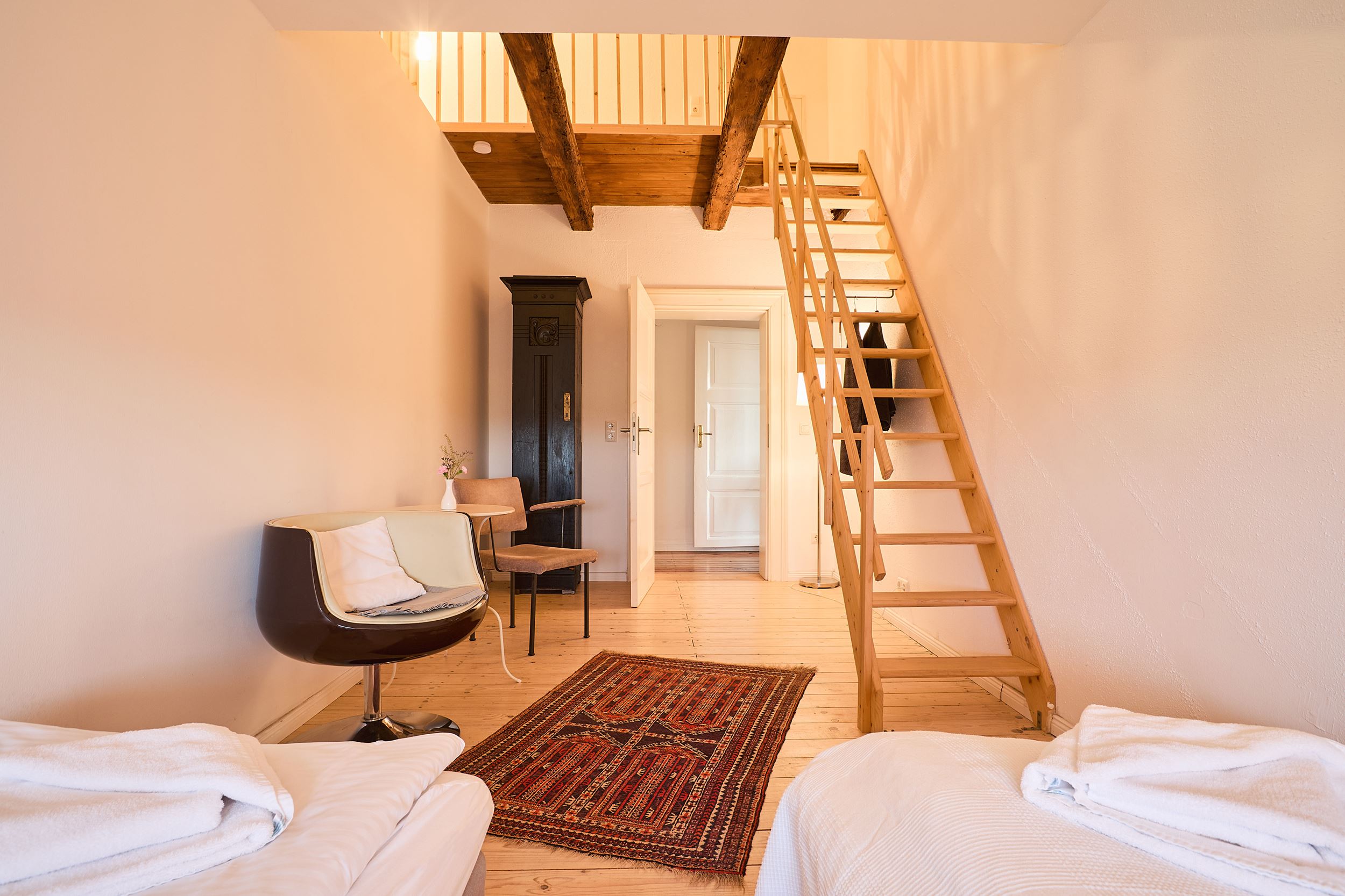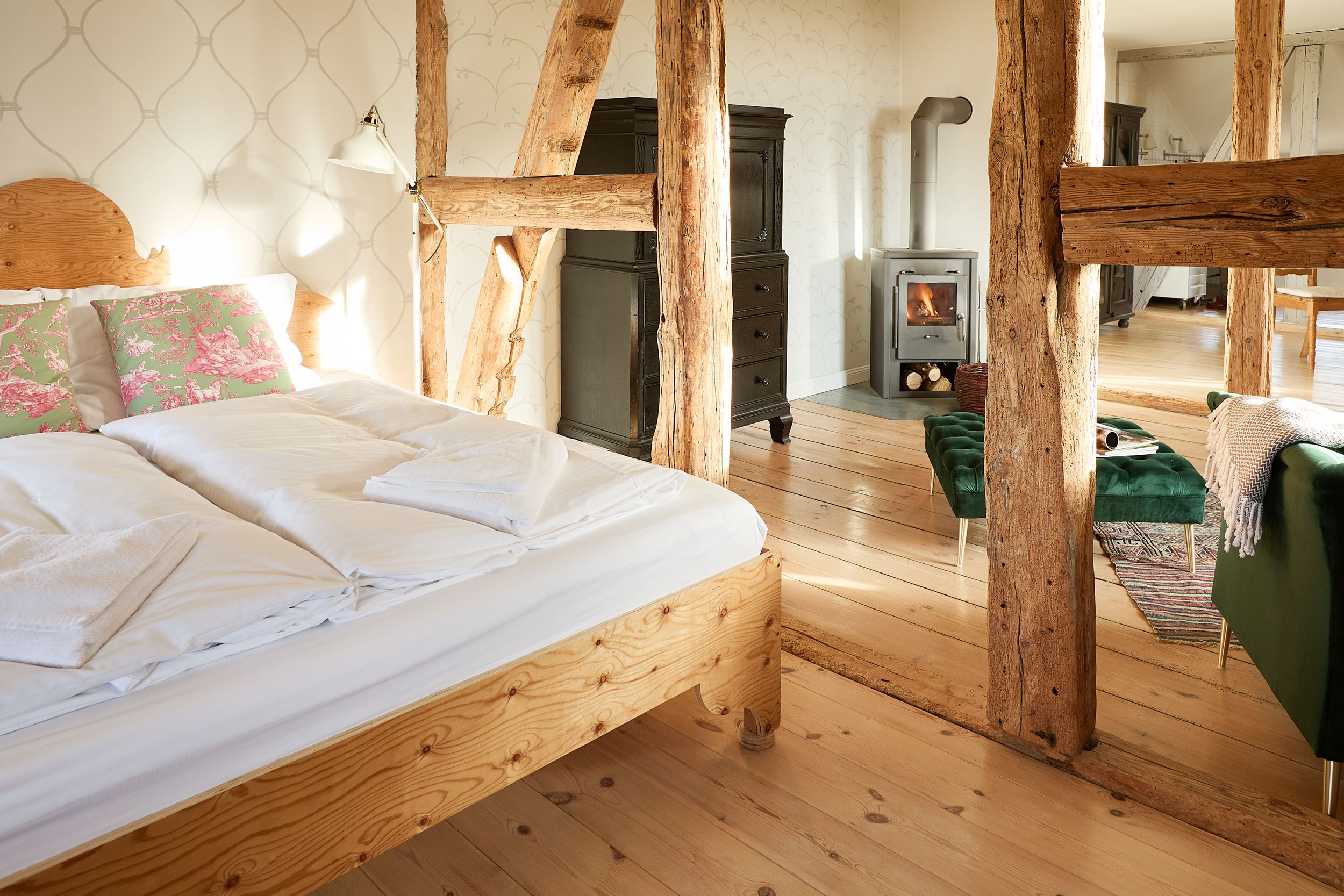 Die Inneneinrichtung ist im skandinavischen Stil, angereicht durch geschmackvolle Antiquitäten. Die hellen Räume im Obergeschoss des Gutshauses mit freistehenden Fachwerkelementen, die als Raumteiler dienen, verleihen der Wohnung eine stilvolle Gemütlichkeit.
