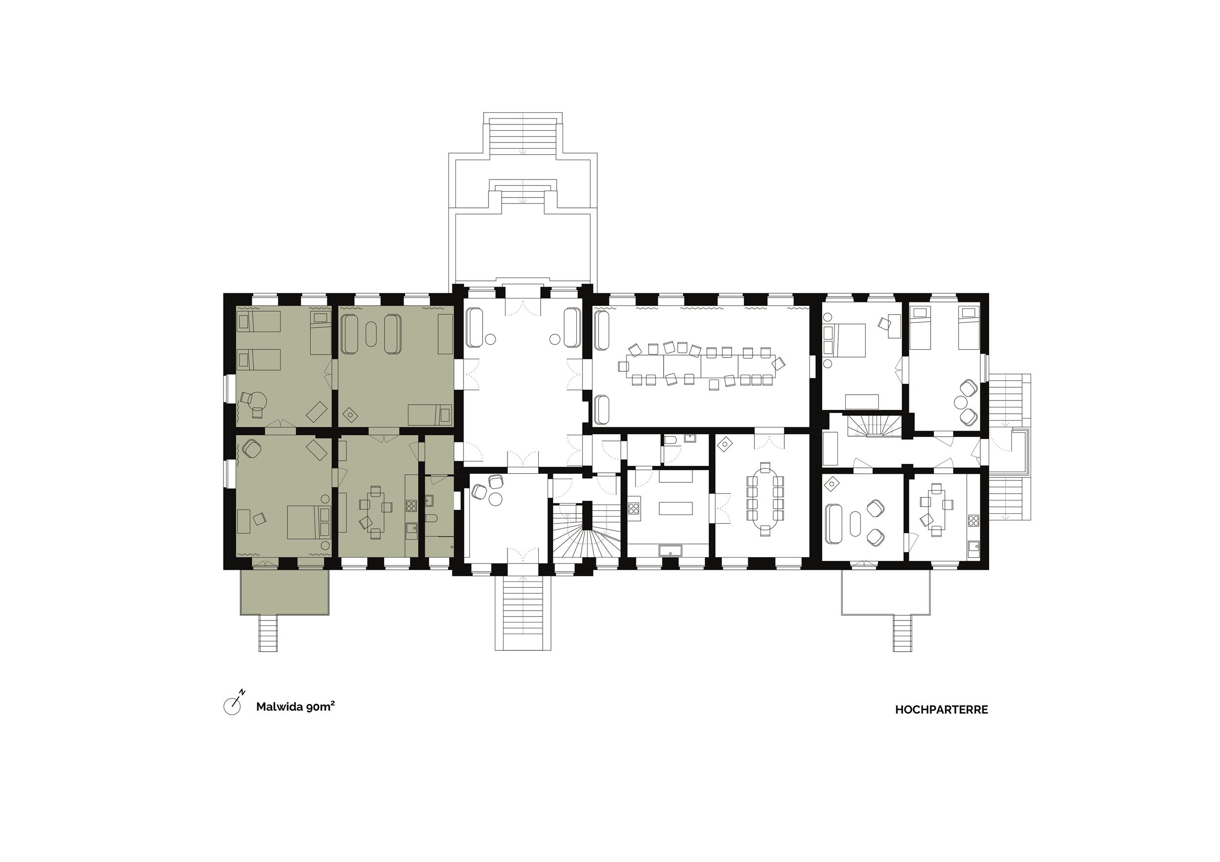 Malwida ist eine helle und sonnige Wohnung in der „Beletage“. Die 130 m² große Wohnung ist sehr großzügig und herrschaftlich. Sie besteht aus drei ca. 30 m² großen Zimmern, die über Flügeltüren miteinander verbunden sind. Im Wohnzimmer ist ein Kaminofen. Die Wohnung hat eine gut ausgestattete Küche mit Esstisch, Gasherd, Küchenzeile mit Spülmaschine sowie ein Badezimmer mit großem Fenster. Der 10.000 m² große Gutshausgarten ist über eine Terrasse direkt zu erreichen.