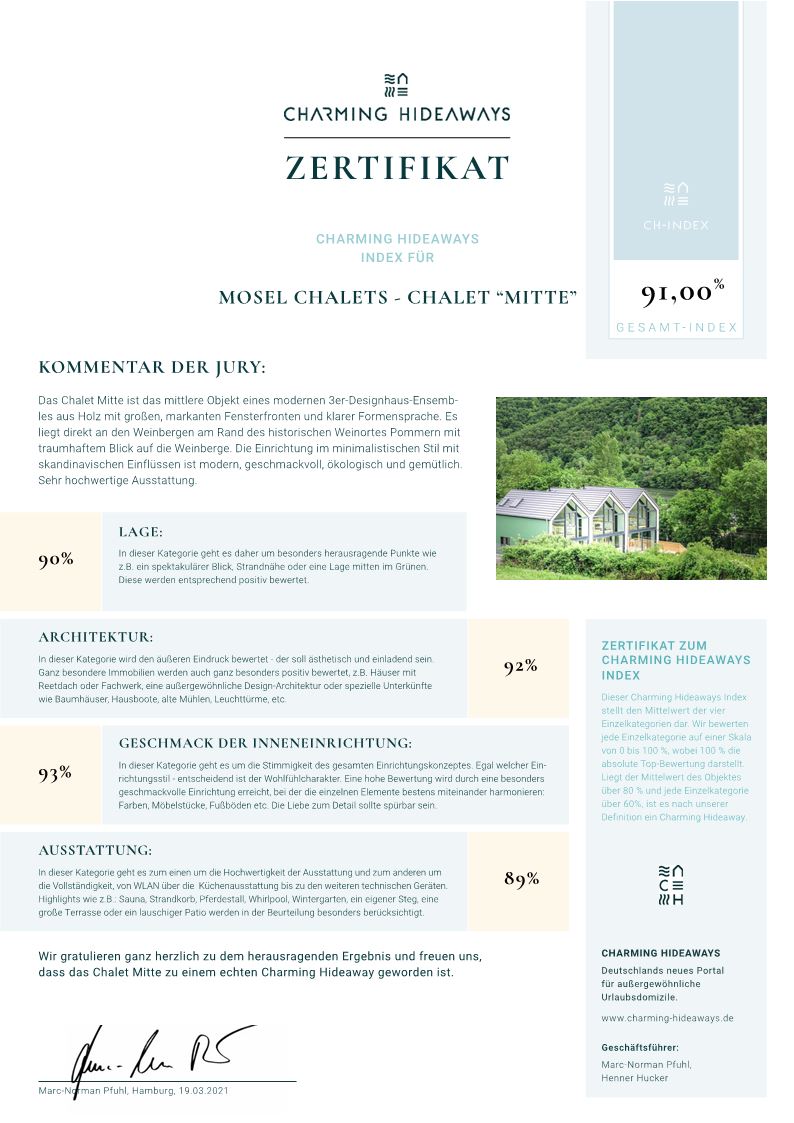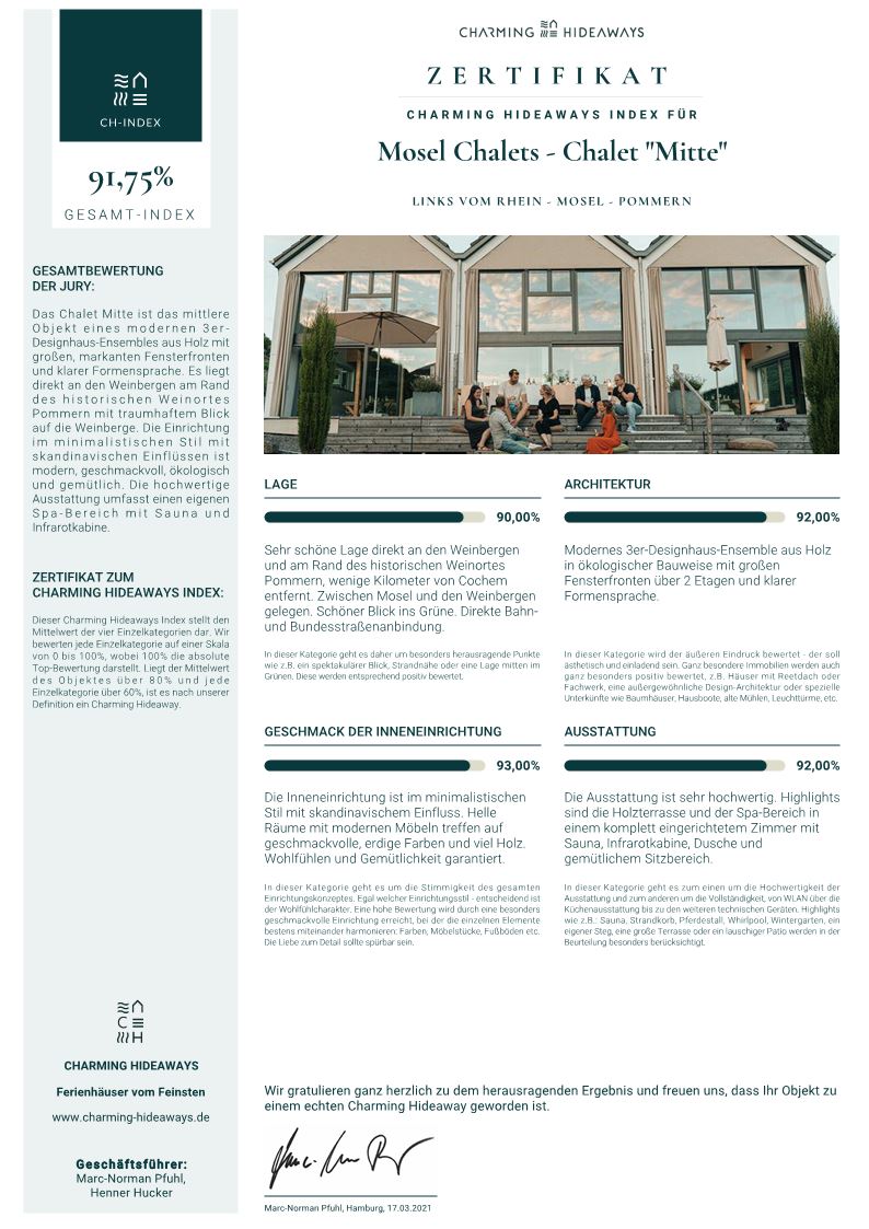 Richtig, wir sind keine Hoteliers und auch keine Firma. Wir sind eine Familie, die sich einen Traum erfüllt hat. Für uns sind unsere drei Moselchalets ein absolutes Herzens-Projekt und es macht uns sehr glücklich zu sehen, wie viel Wertschätzung uns unsere Gäste entgegen bringen, für das, was wir seit Beginn des Baus der Mosel Chalets im September 2018 geschafft haben. Seit Mai 2019 konnten wir schon sehr viele Gäste in unseren Ferienhäusern an der Mosel begrüßen und wir sind sehr stolz, dass der Begriff Ferienhaus Mosel Chalets bereits vielen ein Begriff geworden ist.
