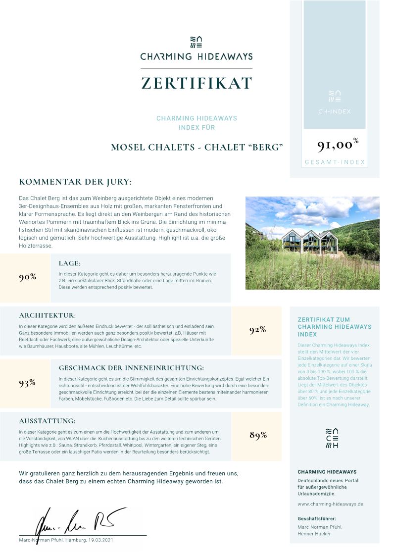 Richtig, wir sind keine Hoteliers und auch keine Firma. Wir sind eine Familie, die sich einen Traum erfüllt hat. Für uns sind unsere drei Moselchalets ein absolutes Herzens-Projekt und es macht uns sehr glücklich zu sehen, wie viel Wertschätzung uns unsere Gäste entgegen bringen, für das, was wir seit Beginn des Baus der Mosel Chalets im September 2018 geschafft haben. Seit Mai 2019 konnten wir schon sehr viele Gäste in unseren Ferienhäusern an der Mosel begrüßen und wir sind sehr stolz, dass der Begriff Ferienhaus Mosel Chalets bereits vielen ein Begriff geworden ist.