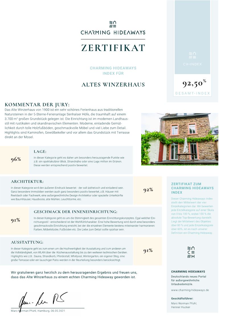 Das Alte Winzerhaus von 1900 ist ein sehr schönes Ferienhaus aus traditionellen Natursteinen in der 5-Sterne-Ferienanlage Senhalser Höfe, die traumhaft auf einem 3.700 qm großen Grundstück gelegen ist. Die Einrichtung ist im modernen Landhausstil mit rustikalen und skandinavischen Elementen. Moderne, einladende Gemütlichkeit durch tolle Holzfußböden, geschmackvolle Möbel und viel Liebe zum Detail. Highlights sind Kaminofen, Gewölbekeller und vor allem das Grundstück mit Terrasse direkt an der Mosel.