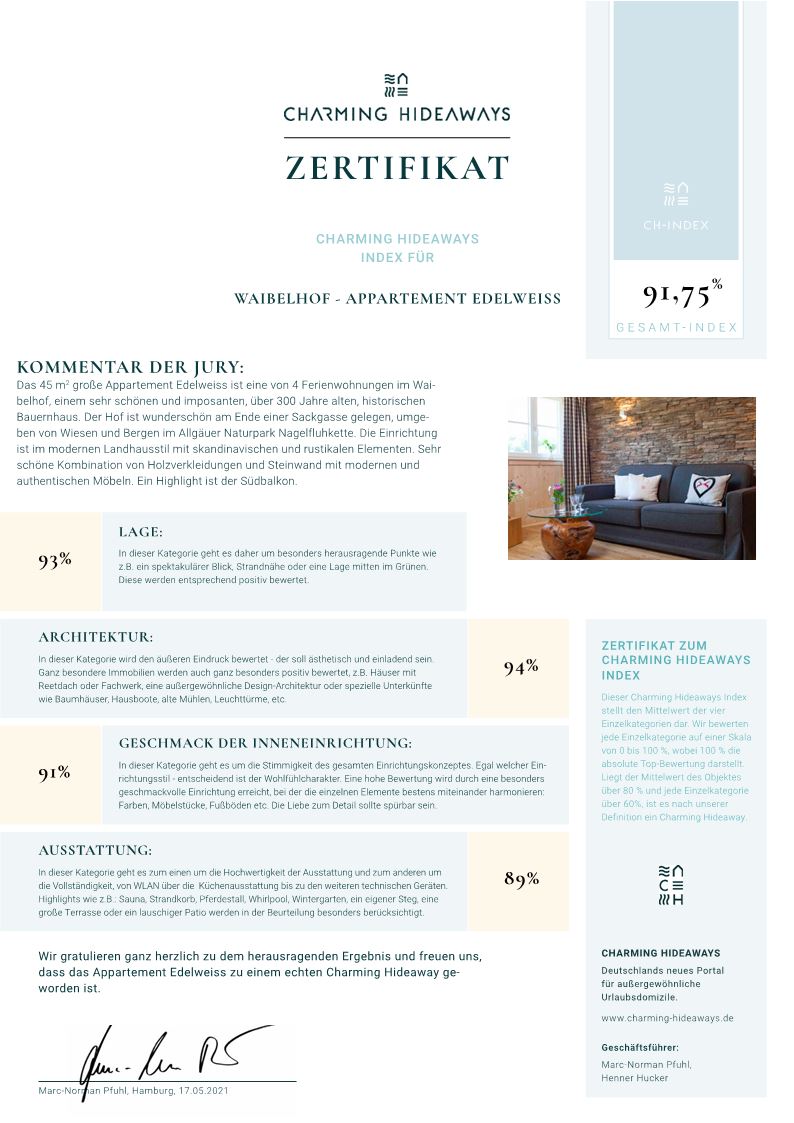 Am Fuße des Naturparks Nagelfluhkette, inmitten des lieblichen Gunzesrieder Tals, liegt malerisch unser 300 jähriges Gut Waibelhof - das ist Urlaub auf dem Bauernhof, wie man es sich erträumt. Ankommen & willkommen sein. Vom ersten Augenblick an erleben Sie die behagliche und sympathische Atmosphäre unseres Bauernhofs, Sie werden sich wohlfühlen! Bei uns finden Sie das Natürliche, das Ursprüngliche, das Liebenswürdige - all dies liegt begründet in unserer langen Tradition, im einfachen ehrlichen Handwerk und der Verbundenheit mit der Natur. Durch sorgsame Modernisierung haben wir den Waibelhof in ein bezauberndes Kleinod mit unvergleichlichem Flair verwandelt. Unser Hof ist die Verbindung von einer kleinen ursprünglichen & bergbäuerlichen Landwirtschaft mit Ochsen und Färsen, einer eigenen Imkerei sowie der Lebendigkeit von Sebastian Kneipp. Viele kleine Details deuten in unserem Hof auf seinen Ursprung hin. Die schöne, aus regionalem Handwerk gefertigte Schindelfassade, die gelebten Traditionen und Generationen... Folgende Leistungen sind inklusive: Tägliche Nutzung von Sauna und Wellness, Erstausstattung mit Bademänteln und Badetüchern, Sat-TV, freies WLAN, Fön, Kosmetikspiegel, duftende Kräuterkissen im Schlafzimmer, Bandscheiben-Matratzen, Safe, Parkplatz am Haus sowie top Tipps Ihrer Gastgeber. Besonderer Glanzpunkt in der Edelweiß: ein zweites Wohnzimmer - in exklusivem Chic. Die rauhe, rustikale Steinwand bringt Romantik ins Interieur, das feine, moderne Leinensofa und der handgefertigte Tisch sorgen für Wärme und Gemütlichkeit für Ihren exklusiven Urlaub im Allgäu. Das schönste Blümlein auf der Welt, das ist das Edelweiß.