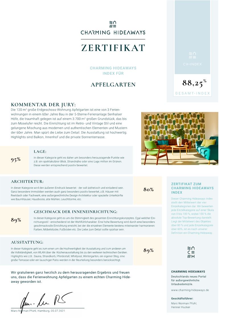 Design-Ferienhäuser auf einem mediterran anmutenden Anwesen mit traumhafter Lage direkt am Moselufer.