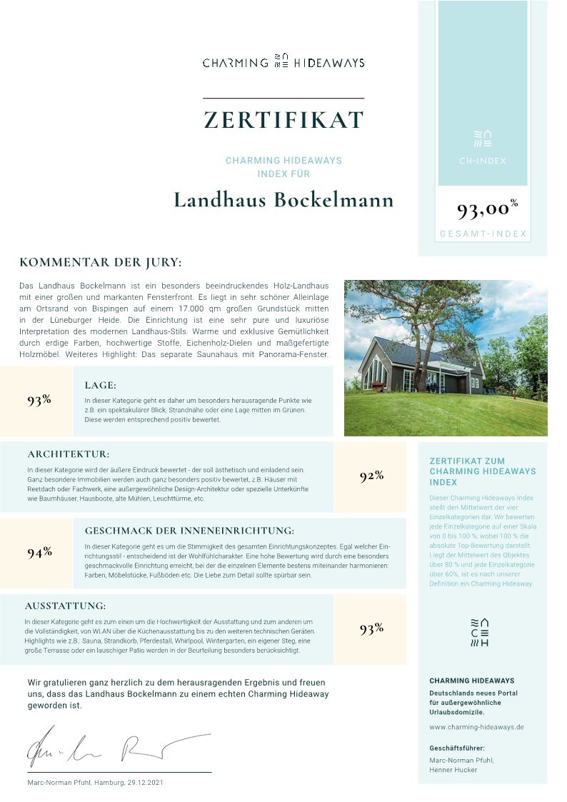 Unser Landhaus befindet sich in Bispingen, im Herzen der Lüneburger Heide. Es liegt auf einem 17.000m² großen Naturgrundstück, mit perfekter Sonnenausrichtung. Das Haus mit seinem Park befindet sich abgeschirmt hinter einem vom Gast zu öffnendem, elektrischem Tor, und bietet eine völlige Abgeschiedenheit direkt am Ort Bispingen. Genießen sie den großen Garten mit seinem besonderen Saunahaus, der stilistischen Kalt-, Warmwasseraußendusche, einem Spielturm für die Kleinen und dem grundstückseigenen Wanderweg. Bispingen liegt zentral in der Lüneburger Heide, alle bekannten Ausflugsziele der Region sind unkompliziert und schnell erreichbar. Für Naturliebhaber empfiehlt sich eine Wanderung in das Naturschutzgebiet Lüneburger Heide, hin zum Wilseder Berg, dem Totengrund, oder auch ins ehemalige Militärgelände mit seiner weitläufigen Heidefläche. Als Ausgangsstation für Ihre Wanderungen empfehlen wir den historischen Heideort Oberhaverbeck. Hier finden Sie im Café Bockelmann auch die beste Buchweizentorte der Region. Ebenfalls können Sie von dort eine der beliebten Heidekutschfahrten unternehmen.