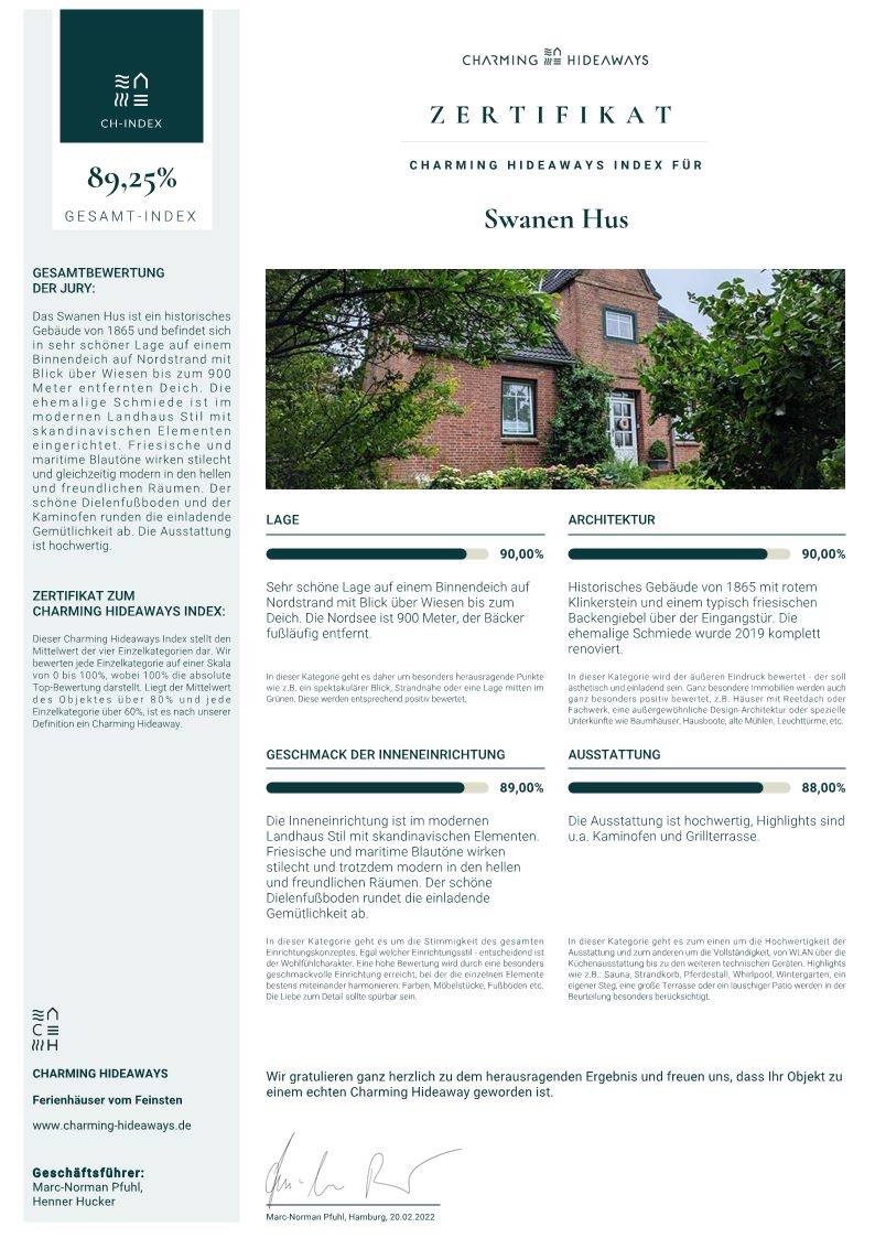 Die alte Schmiede war schon lange mein Lieblingshaus auf Nordstrand, es ist so ein stattliches Friesenhaus mit wunderschönem Erker - und meiner Meinung nach das schönste Haus der Insel. Auch die vielen schönen Rosenstöcke am Haus und im Garten machen das Swanen Hus zu einer Besonderheit. Als es dann zum Verkauf stand, musste ich zuschlagen. Ich habe viel Mühe darauf verwandt, es gemütlich, friesisch und trotzdem modern und künstlerisch einzurichten und alles vorzuhalten, was Gäste brauchen könnten. Ich bin selbst immer wieder überrascht, wie groß das Swanen Hus doch ist, nicht nur die Wohnzimmer und die Wohnküche, sondern auch die drei Schlafzimmer. Ich bin sicher, dass das Haus hervorragend in die Auswahl der Charming Hideaways passt und das Angebot in Nordfriesland sehr gut ausweitet. Ich plane außerdem in diesem Jahr verschiedene Sonderanlässe: Yoga Retreats, Kunstwochenenden, etc.