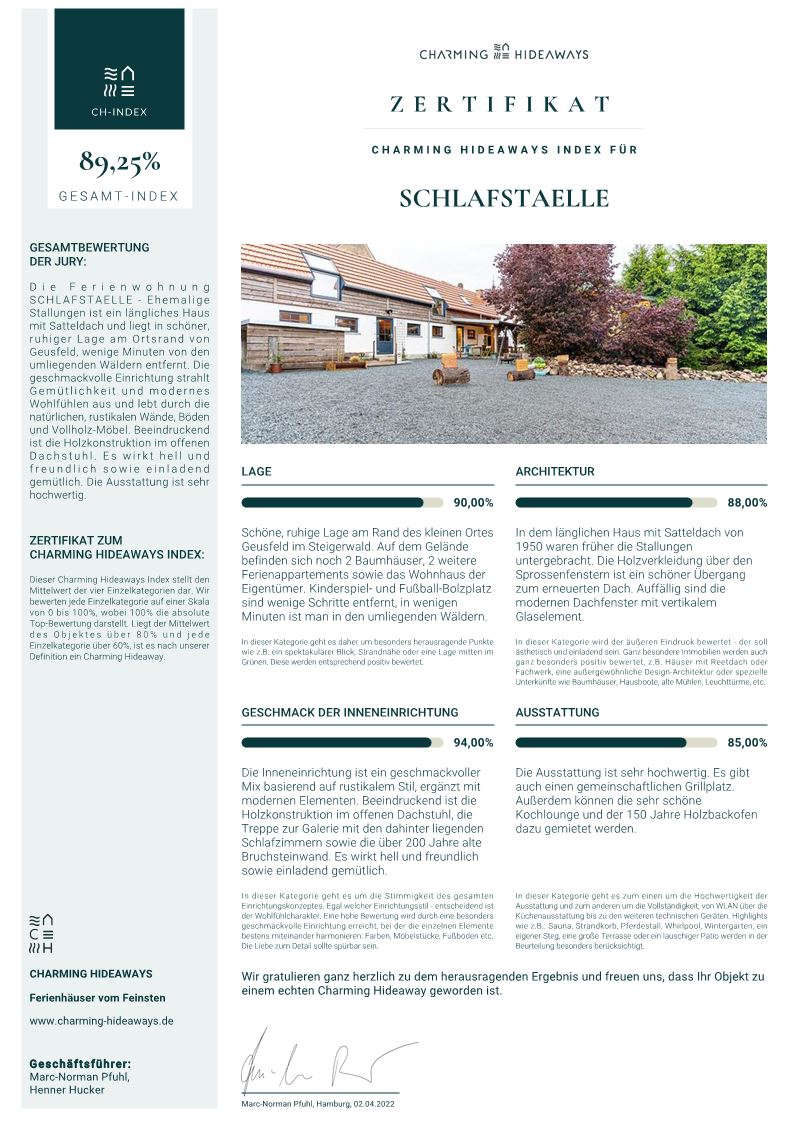 Wir haben bei der Sanierung des alten Gebäudes alle Ideen selbst entwickelt und viel ausprobiert. Neben harter Arbeit hat uns dies vor allen Dingen auch unheimlich großen Spaß gemacht. Unsere daraus entstandene neue Leidenschaft und die sehr positive Resonanz aus dem Umfeld haben uns dazu bewogen, auch noch die alte Scheune in das Konzept zu integrieren. Bei der Umsetzung unserer Projekte verwirklichen wir uns selbst und nehmen nichts "von der Stange". Dies und die Liebe zum Detail spürt man in allen Räumen der SCHLAFSTAELLE. Zudem liegt uns das Thema Nachhaltigkeit sehr am Herzen. Für die Selbstversorgung unserer Gäste bieten wir eine "Minibar" mit ausgewählte, hochwertige Produkte von heimischen Familienbetrieben. Unser Warmwasser wird an schönen Tagen zu 100% aus unserer Solarthermieanlage gewonnen, ebenso wie der Strom aus unserer Photovoltaikanlage. Außerhalb der Sonnenstunden wird die Wärme von unserer Holzheizung produziert und wir beziehen 100% Ökostrom, um nur ein paar Beispiele zu nennen.