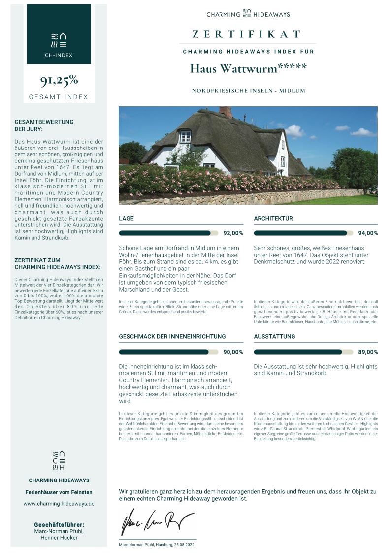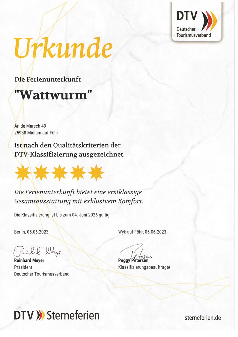 "Kleinigkeiten sind es, die Perfektion ausmachen, aber Perfektion ist alles andere als Kleinigkeit". Diesen Satz von Henry Royce kann man bedenkenlos auf das Haus Wattwurm übertragen. Während der 25jährigen Vermietungsphase wurde das Haus permanent auf optisch neuesten Stand gebracht, das alleine schon einen gelungenen Urlaub gewährleistet. Zusätzlich bekommt man als Gast Annehmlichkeiten, die über eine normale Vermietung hinausgehen. Das Haus Wattwurm wurde hierfür bereits zum sechsten Mal in Folge vom DTV mit F***** ausgezeichnet.