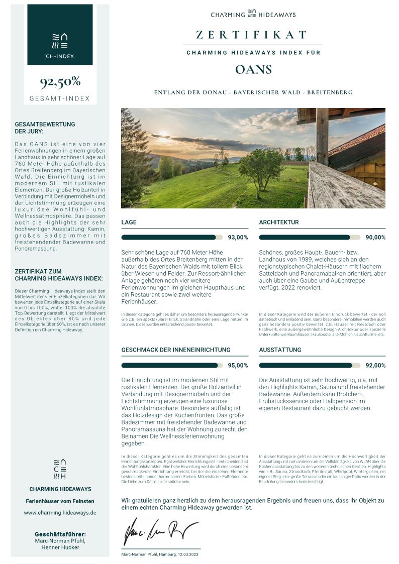 Unsere "Wellnessferienwohnung Oans" bietet einen offen geschnittenen Wohnbereich mit direktem Zugang zum eigenen Panoramabalkon. Die eigene Sauna bietet ein Außenfenster, sowie Bademäntel und Saunatücher. Das geräumige Wellnessbadezimmer verfügt über zwei Tropenregenduschen und frei stehende Badewanne. Die Toilette ist separat. Das Schlafzimmer hat einen eigenen Flachbild TV und ein überlanges Boxspringbett (2,20 m lang).