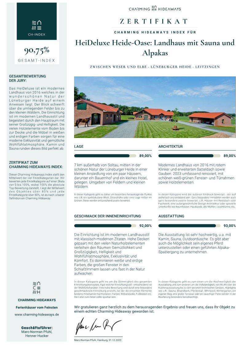 Das Heideluxe Landhaus ist mehr als nur eine Ferienunterkunft; es ist ein Ort, an dem sich Natur, Komfort und Kultur vereinen, um unseren Gästen ein unvergessliches Erlebnis zu bieten. Es ist ein Ort, der Geschichten erzählt und Erinnerungen schafft – ein wahres Charming Hideaway