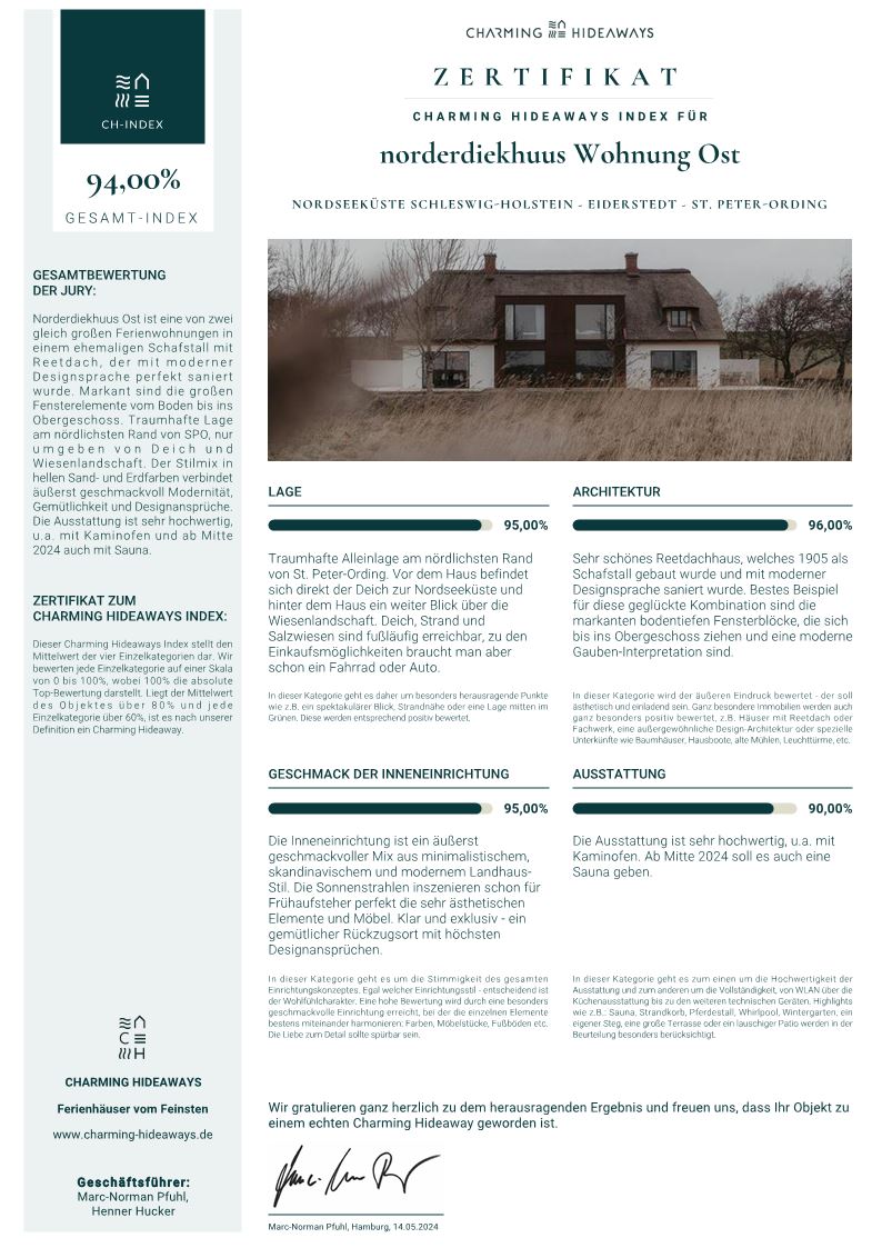 Norderdiekhuus Ost ist eine von zwei gleich großen Ferienwohnungen in einem ehemaligen Schafstall mit Reetdach, der mit moderner Designsprache perfekt saniert wurde. Markant sind die großen Fensterelemente vom Boden bis ins Obergeschoss. Traumhafte Lage am nördlichsten Rand von SPO, nur umgeben von Deich und Wiesenlandschaft. Der Stilmix in hellen Sand- und Erdfarben verbindet äußerst geschmackvoll Modernität, Gemütlichkeit und Designansprüche. Die Ausstattung ist sehr hochwertig, u.a. mit Kaminofen und ab Mitte 2024 auch mit Sauna.