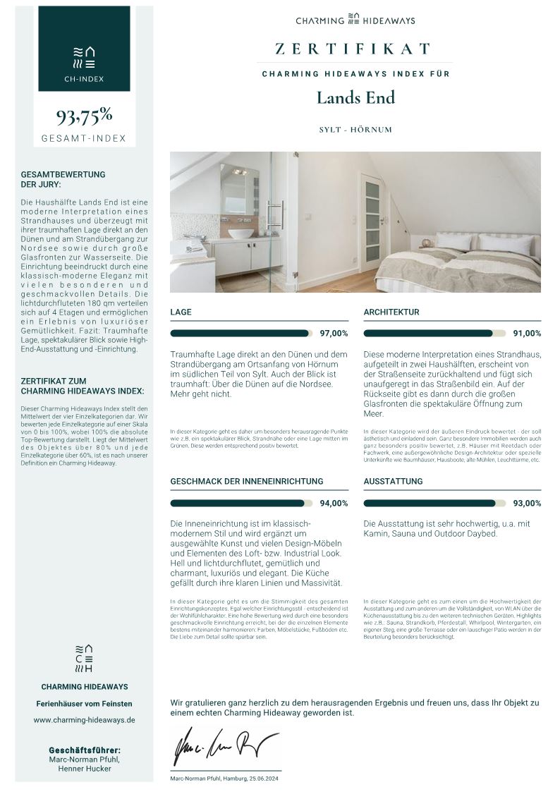 Freuen Sie sich auf spektakuläre Sonnenuntergänge. Im Inneren erwartet Sie eine ansprechende Inneneinrichtung im besonderen Ambiente von Höpershof Sylt designed. Das luxuriöse Haus verfügt über 180m² Wohnfläche über 4 Etagen mit Meerblick und bietet ausreichend Platz für bis zu sechs Personen. Das großzügige und lichtdurchflutete Wohnzimmer mit Couchgarnitur und Kamin lädt zu kuscheligen Stunden vor dem Fernseher ein. Die offene Küche mit Gasherd, Backofen, Geschirrspüler, Kühlschrank mit Gefrierfach, Nespressomaschine, Wasserkocher und weiteren Utensilien bietet alles, um sich selbst zu versorgen. In den stilvollen und modernen Schlafzimmern erwarten Sie zwei Doppelbetten sowie zwei Einzelbetten und sorgen für einen ruhigen Schlaf. Ein schickes, modernes Bad mit Tageslicht und Wanne und ein Bad mit Dusche und zwei Gäste-WC runden das Angebot ab. In der hauseigenen Sauna befindet sich ebenfalls ein Bad.