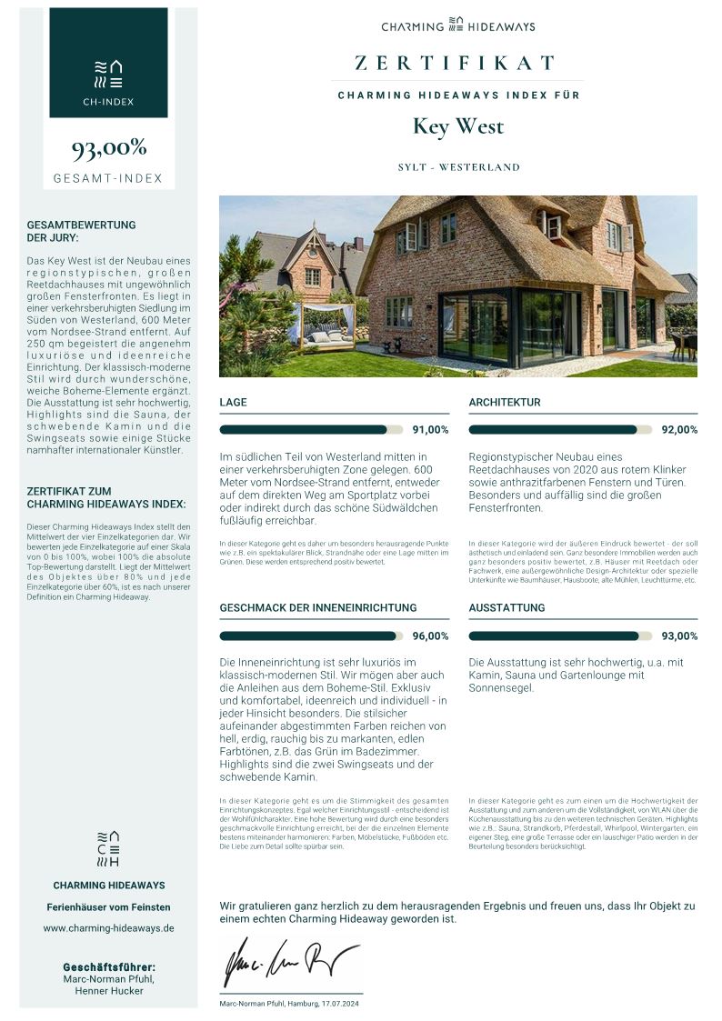 Hohe Decken und bodentiefe Fenster schaffen ein freies Raumgefühl und einen offenen Blick auf Sonnenterrasse und Garten. Hier trifft Tradition auf Moderne. Außen friesische Gemütlichkeit, innen spannendes Design auf höchstem Niveau. Ideenreich, modern ausgestattet und möbliert mit Stücken namhafter internationaler Designer. Optisches Highlight im offenen Wohnraum: die Swingseats und der schwebende Kamin. Der luxuriöse Wohn-Essbereich mit bodentiefen Fenstern und wunderschönem Blick in den Garten ist der Mittelpunkt des Hauses. Das Wohnzimmer mit Couchgarnitur und Kamin lädt zu kuscheligen Stunden ein. Die hochwertige, voll ausgestattete integrierte Gourmetküche mit Mittelblock bietet mit Backofen, Spülmaschine, vollautomatischer Kaffeemaschine, Wasserkocher und weiteren Utensilien, alles um Gäste oder die Familie auf höchstem Niveau zu versorgen. In vier separaten Schlafzimmern ist reichlich Platz für bis zu 8 Personen. Die stilvollen und modernen Räume sind mit Doppelbetten (180x200 ) ausgestattet. Eines der Schlafzimmer bietet ein integriertes Duschbad.Zusätzlich runden ein großzügiges Bad mit Sauna, Badewanne und bodengleicher Dusche, ein weiteres Duschbad sowie ein Gäste-WC das Angebot ab.
