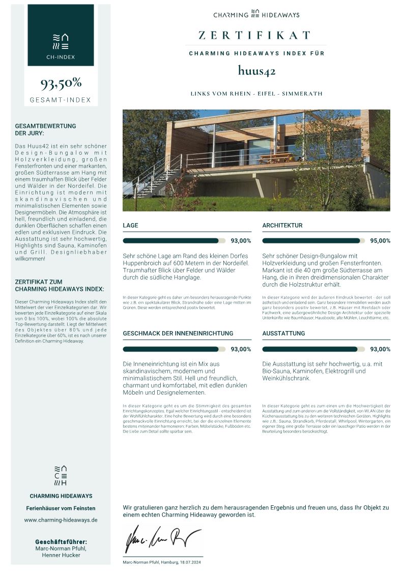 huus42 ist ein Geheimtip in der Nordeifel. Leicht erreichbar aus Köln/ Bonn/ Düsseldorf. Ideal auch für gestresste Grosstädter, die eine Auszeit suchen ohne weite Anreise. Aber nicht nur Kurzurlauber entdecken und geniessen die vielfältigen Möglichkeiten der Eifel rund um huus42. Das Haus besticht durch seine Lage und Architektur. Die Einrichtung ist sehr persönlich und hochwertig. huus42 bietet grosses Kino zu jeder Jahreszeit. Alleine die 14 m verglaste Front mit Schiebetüren bietet einen phantastischen Weitblick auf die Eifelhöhen. Innen und Aussen gehen nahtlos ineinander über und werden erlebbar. Jede Jahreszeit wird so zum Erlebnis. Egal ob unsere Gäste sich nur in das Haus zurückziehen und relaxen oder aktiv die Eifellandschaft erleben.