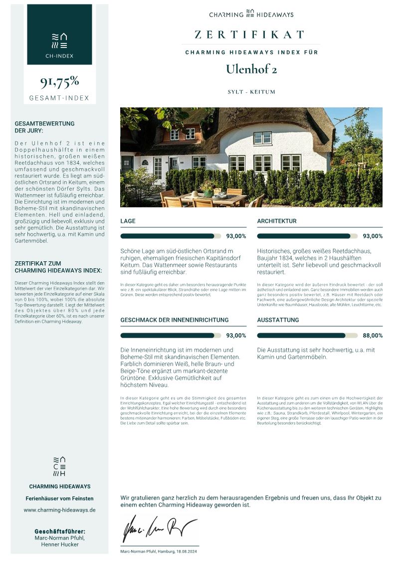 Der Ulenhof 2 ist eine Doppelhaushälfte in einem historischen, großen weißen Reetdachhaus von 1834, welches umfassend und geschmackvoll restauriert wurde. Es liegt am süd-östlichen Ortsrand in Keitum, einem der schönsten Dörfer Sylts. Das Wattenmeer ist fußläufig erreichbar. Die Einrichtung ist im modernen und Boheme-Stil mit skandinavischen Elementen. Hell und einladend, großzügig und liebevoll, exklusiv und sehr gemütlich. Die Ausstattung ist sehr hochwertig, u.a. mit Kamin und Gartenmöbel.