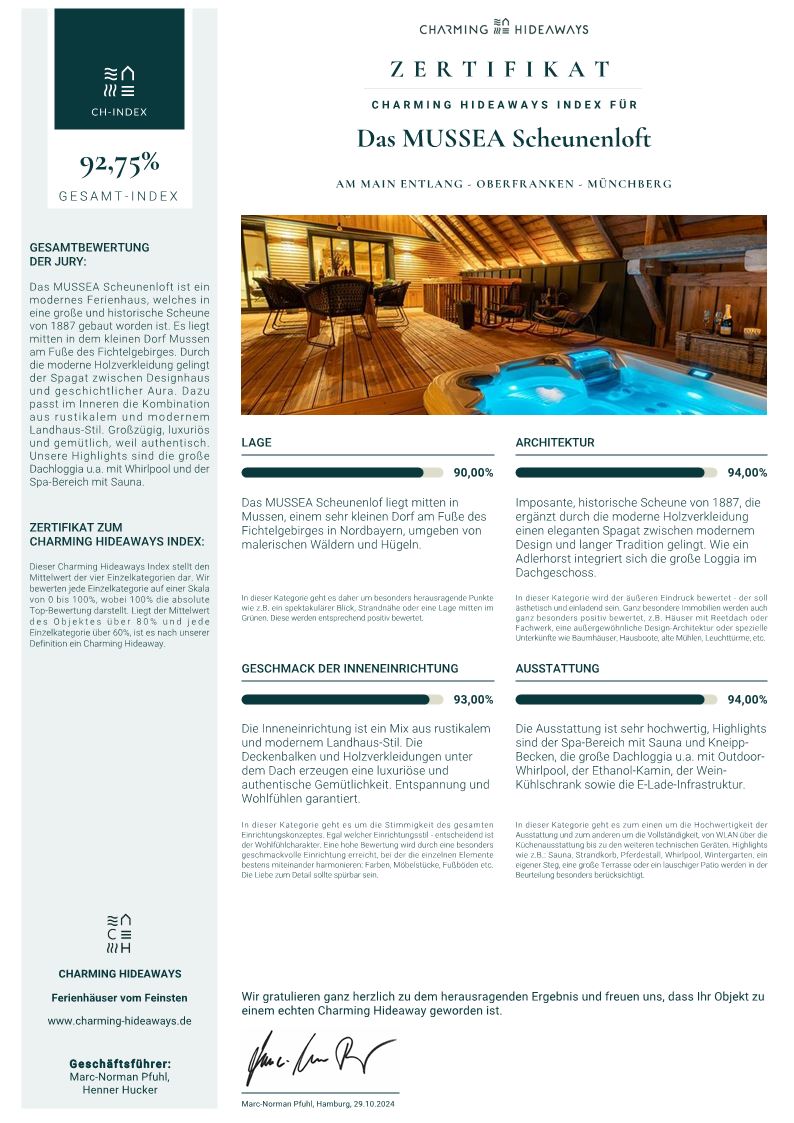 Seit 2016 sind wir mit dem MUSSEA Landhaus Chalet Gastgeber mit ganzem Herzen. Auf unserem urfränkischem Hof leben wir unseren Traum mit unseren Gästen. Sie haben bei uns nicht nur eine Buchungsnummer im Kalender, sondern vertrauen uns ihre kostbarste Zeit an: Ihre Urlaubszeit. So spornt es uns an, jeden Aufenthalt so schön wie nur möglich werden zu lassen. Mit großer Leidenschaft bringen wir unseren Gästen ein Stück Dorfleben, Heimat und Geborgenheit näher. Dies verbinden wir mit einem liebevollen, diskreten Service für alle Erholungssuchenden, welche bei uns wunderschön wohnen und ganz privat entspannen können. Trotz allem Luxus soll Reisen ins MUSSEA auch nachhaltig sein. So sind wir als eines der kleinsten Häuser stolz auf unser Zertifikat des GreenSign-Instituts. Besonders willkommen sind bei uns die Fellnasen! Oft ist es schwierig, tolle Häuser zu finden, in denen auch die Hunde nicht nur gern gesehen, sondern willkommen sind. Bei uns steht die Tür zum Traumurlaub für alle offen!