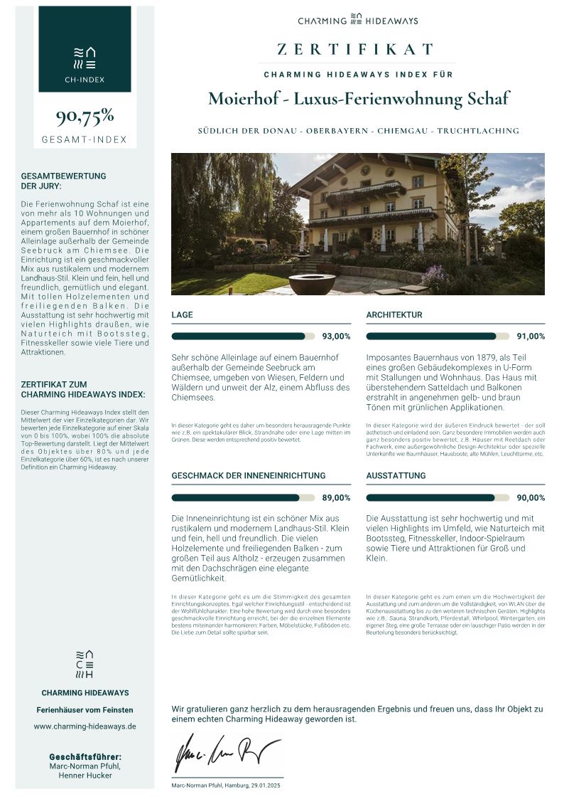 Die Ferienwohnung Schaf ist eine von mehr als 10 Wohnungen und Appartements auf dem Moierhof, einem großen Bauernhof in schöner Alleinlage außerhalb der Gemeinde Seebruck am Chiemsee. Die Einrichtung ist ein geschmackvoller Mix aus rustikalem und modernem Landhaus-Stil. Klein und fein, hell und freundlich, gemütlich und elegant. Mit tollen Holzelementen und freiliegenden Balken. Die Ausstattung ist sehr hochwertig mit vielen Highlights draußen, wie Naturteich mit Bootssteg, Fitnesskeller sowie viele Tiere und Attraktionen.