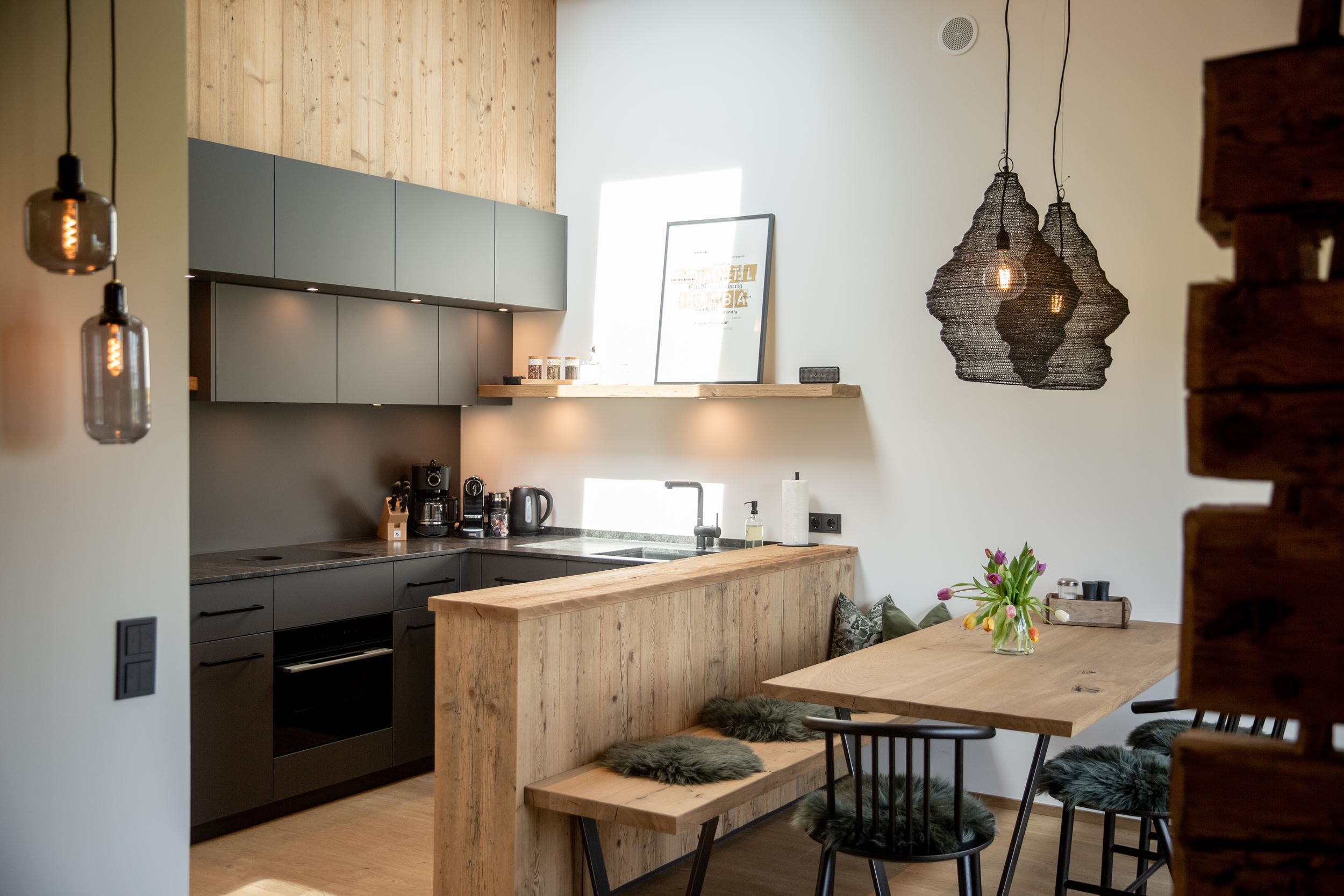 "Genuss-Eck“ zur Selbstbedienung mit selbstgemachten Marmeladen, Honig, Müsli, Käse, Butter und Joghurt der Andechser Molkerei, Apfelsaft – gepresst von unseren eigenen Äpfeln, Eier von Bacherhof, Speck von der Speckalm, Eingekochtes von Mary`s Esszimmer