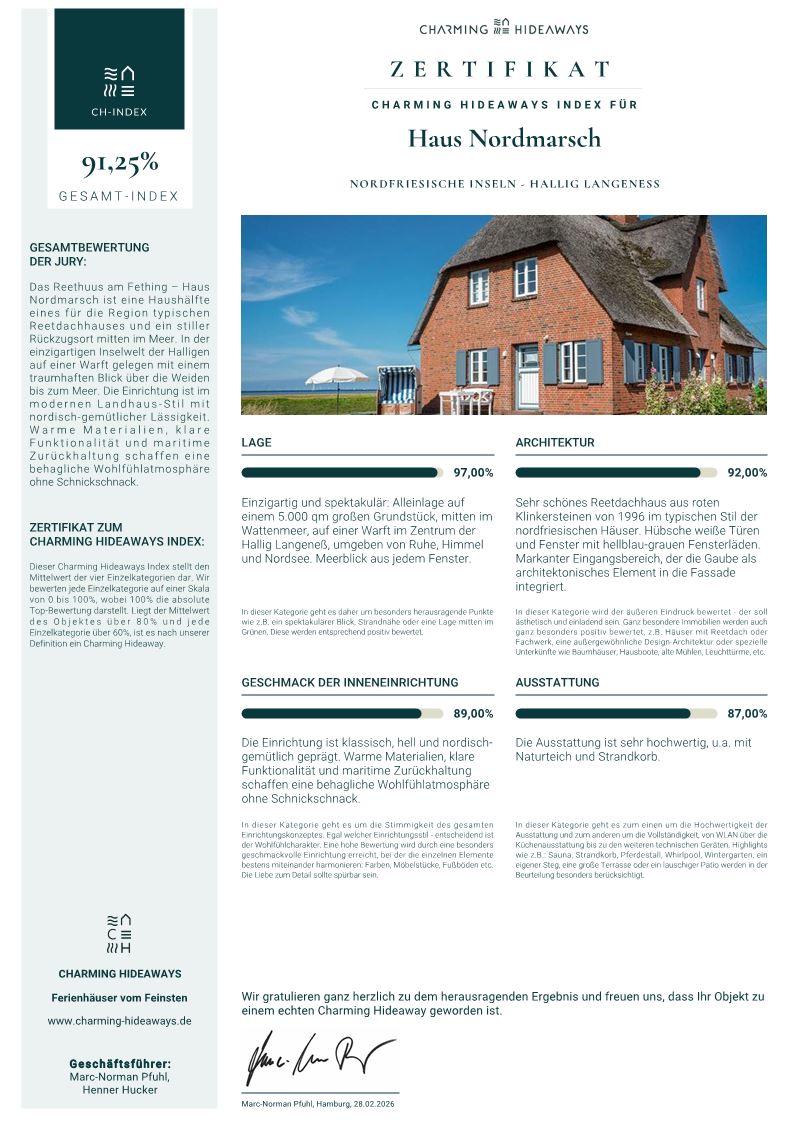 Das Reethuus am Fething – Haus Nordmarsch ist eine Haushälfte eines für die Region typischen Reetdachhauses und ein stiller Rückzugsort mitten im Meer. In der einzigartigen Inselwelt der Halligen auf einer Warft gelegen mit einem traumhaften Blick über die Weiden bis zum Meer. Die Einrichtung ist im modernen Landhaus-Stil mit nordisch-gemütlicher Lässigkeit. Warme Materialien, klare Funktionalität und maritime Zurückhaltung schaffen eine behagliche Wohlfühlatmosphäre ohne Schnickschnack.