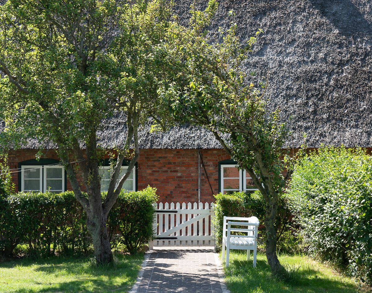 Sehr schönes Reetdachhaus aus roten Klinkersteinen von 1996 im typischen Stil der nordfriesischen Häuser. Hübsche weiße Türen und Fenster mit hellblau-grauen Fensterläden. Markanter Eingangsbereich, der die Gaube als architektonisches Element in die Fassade integriert.